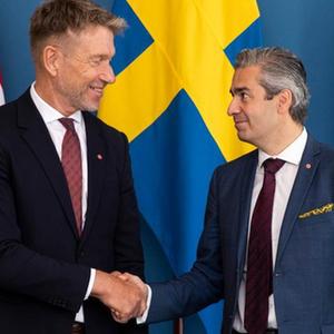 9月5日,在瑞典斯德哥爾摩,瑞典能源與數字化發(fā)展大臣哈沙亞爾·法爾曼巴(右)與挪威石油和能源大臣泰耶·奧斯蘭共同出席新聞發(fā)布會(huì )。