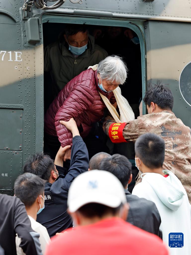 9月7日,首批從海螺溝搭乘直升機疏散出來(lái)的滯留人員抵達瀘定縣磨西鎮。新華社記者 沈伯韓 攝