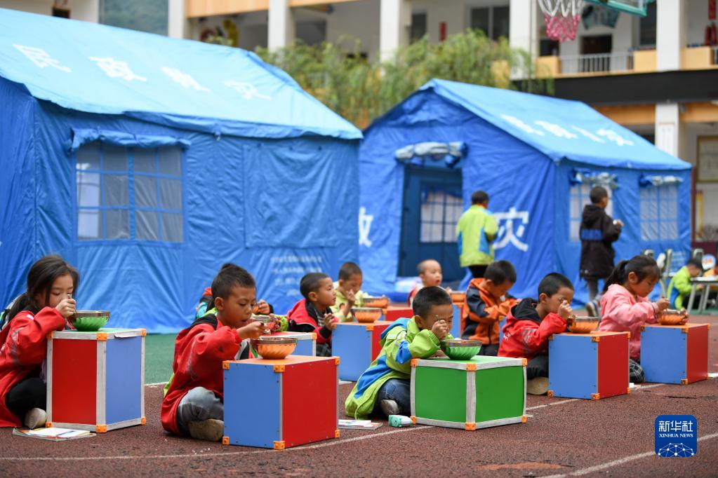 9月7日,學(xué)生們在石棉縣草科鄉中心小學(xué)內吃午飯。