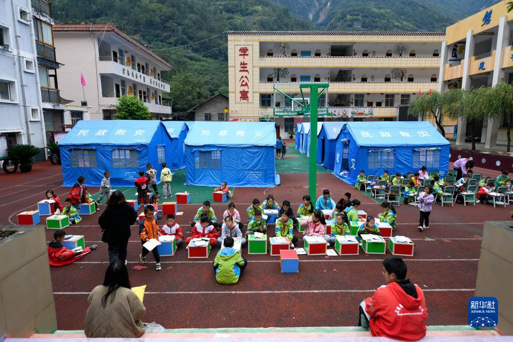 9月7日,學(xué)生們在石棉縣草科鄉中心小學(xué)操場(chǎng)上上課。