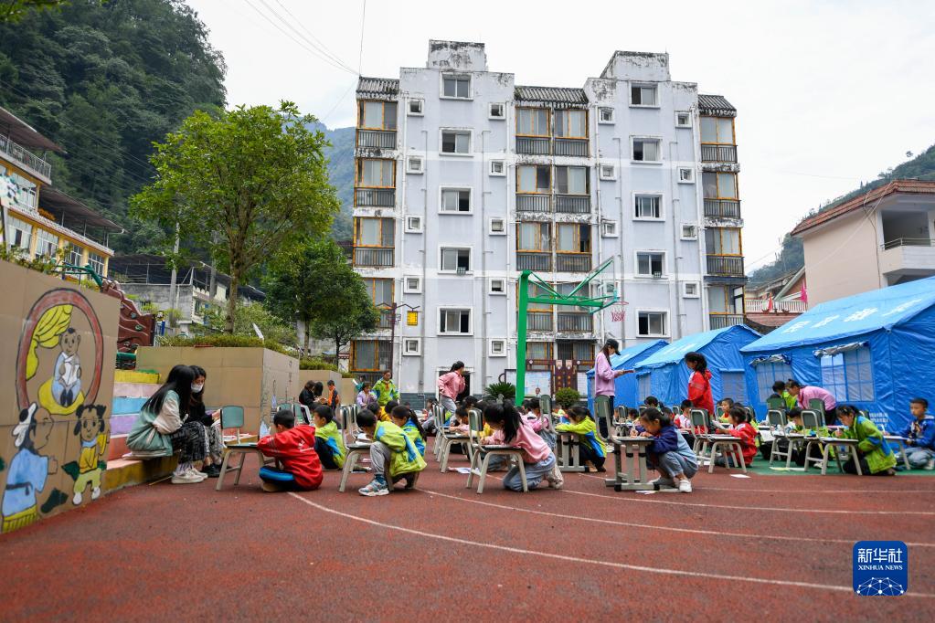 9月7日,學(xué)生們在石棉縣草科鄉中心小學(xué)操場(chǎng)上上課。