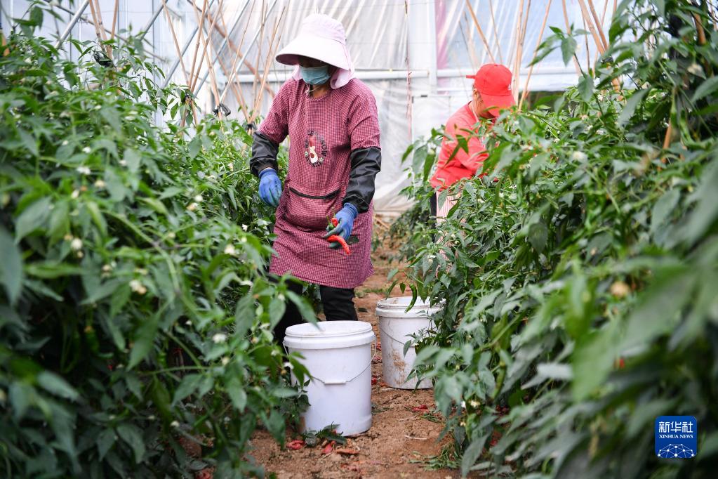 9月5日,工作人員在位于麟游縣九成宮鎮西坊村的農業(yè)示范園采摘辣椒。