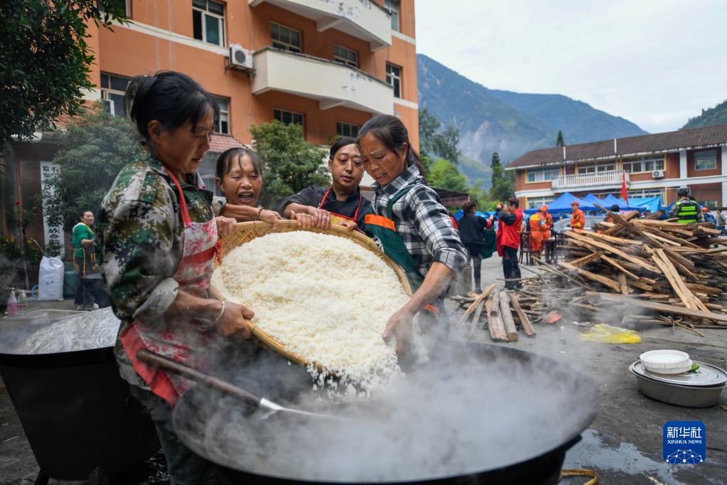 9月7日,在石棉縣草科鄉政府安置點(diǎn)內,當地群眾在準備午飯。