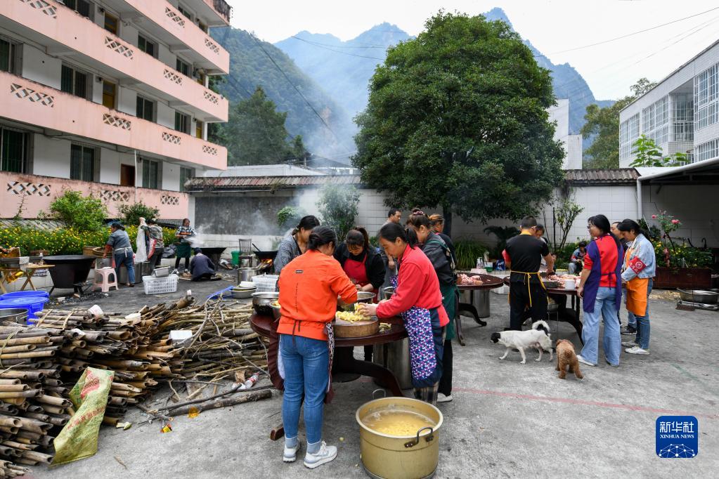 9月7日,在石棉縣草科鄉政府安置點(diǎn)內,當地群眾在準備午飯。