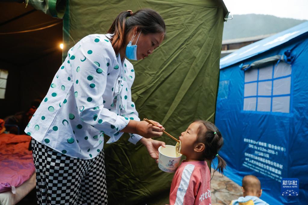 9月7日,在瀘定縣磨西鎮的地震災后安置點(diǎn),人們在吃飯。