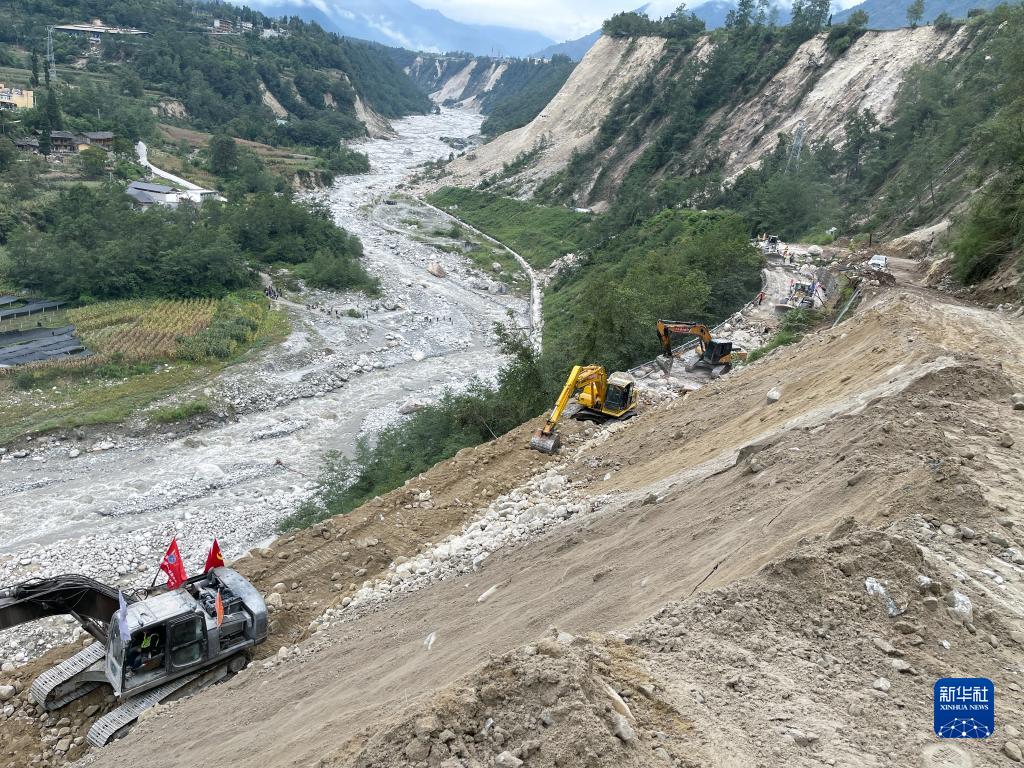9月7日,在四川省甘孜州瀘定縣磨西鎮附近,四川路橋的工作人員在搶修通往海螺溝景區的道路。