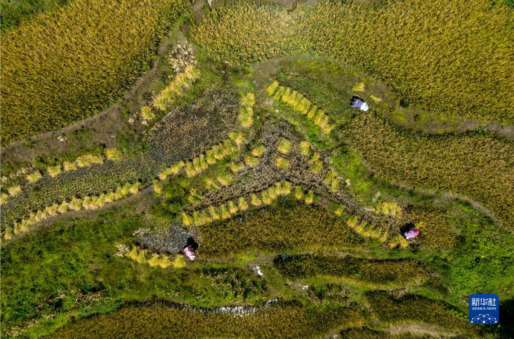 村民在梯田中收割水稻(無(wú)人機照片,9月7日攝)。