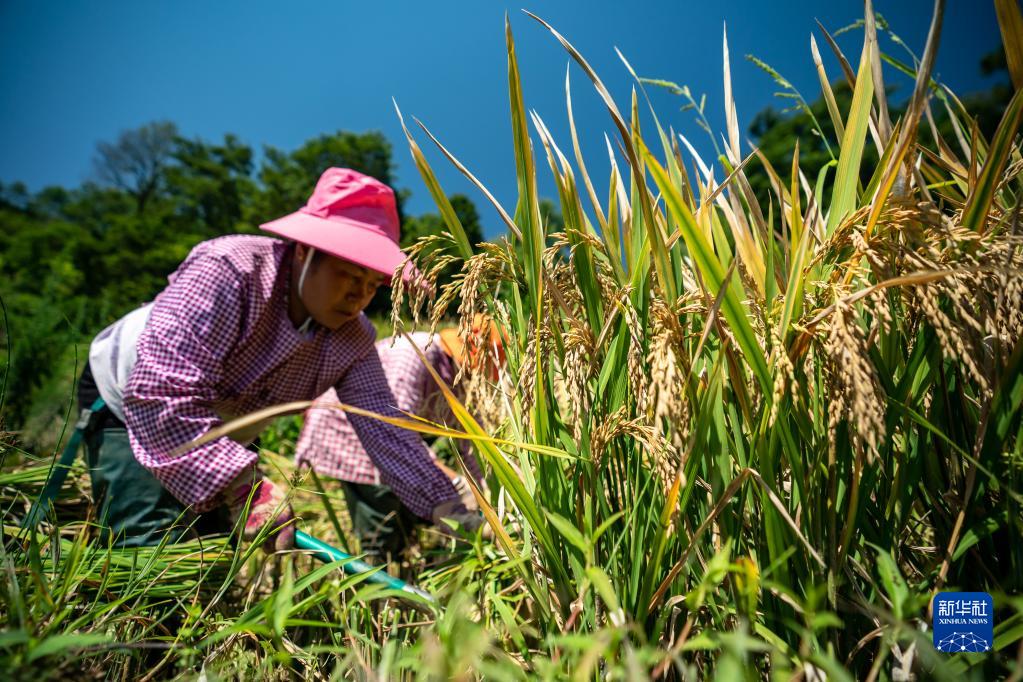 村民在梯田中收割水稻(9月7日攝)。