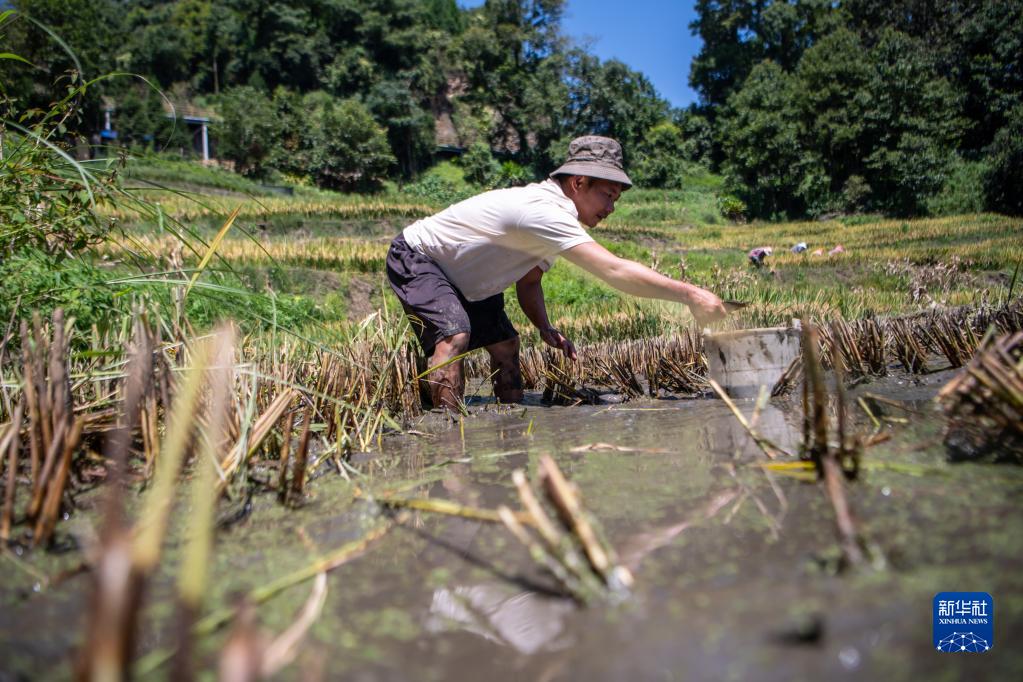 村民在收獲后的稻田里捕撈稻田魚(yú)(9月7日攝)。