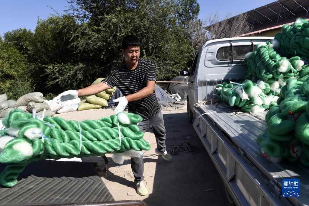 9月7日,在無(wú)棣縣小泊頭鎮一漁網(wǎng)加工企業(yè),工人在裝運銷(xiāo)往廣州的漁網(wǎng)。