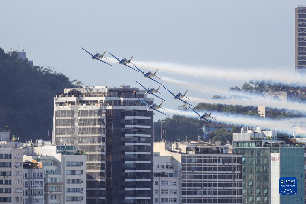 9月7日,飛機在巴西里約熱內盧科帕卡巴納海灘上空進(jìn)行飛行表演,慶祝巴西獨立200周年。