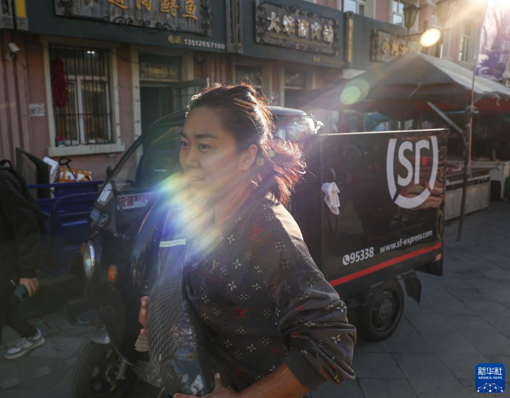 9月4日,在撫遠市東極魚(yú)市,一名魚(yú)商抱著(zhù)剛剛捕撈上岸的魚(yú)。