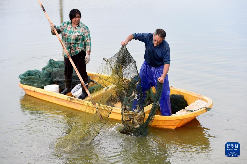 9月8日,在五河縣沱湖鄉大崗村大閘蟹養殖基地,當地農戶(hù)在捕撈大閘蟹。