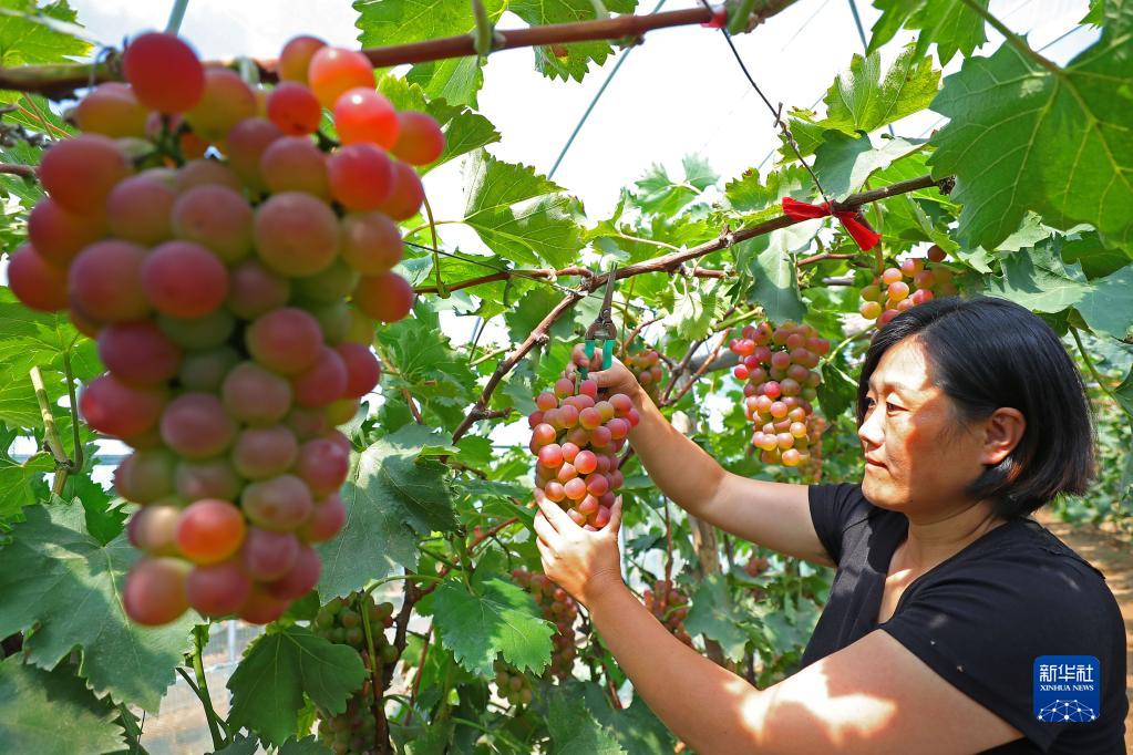 9月6日,在丁家房鎮大蛇山子村,果農在大棚里采摘葡萄。