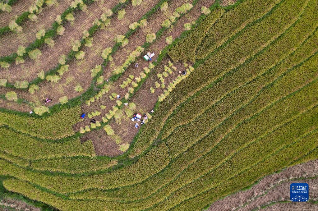9月7日,嵐皋縣南宮山鎮桂花村村民在古梯田上收水稻(無(wú)人機照片)。