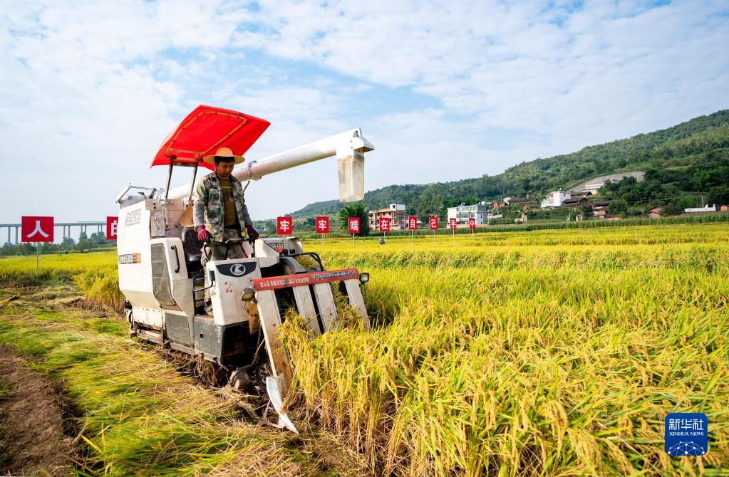 9月8日,收割機在測產(chǎn)現場(chǎng)收割“楚粳54號”水稻。
