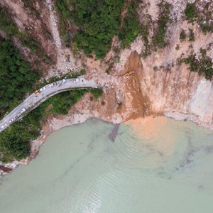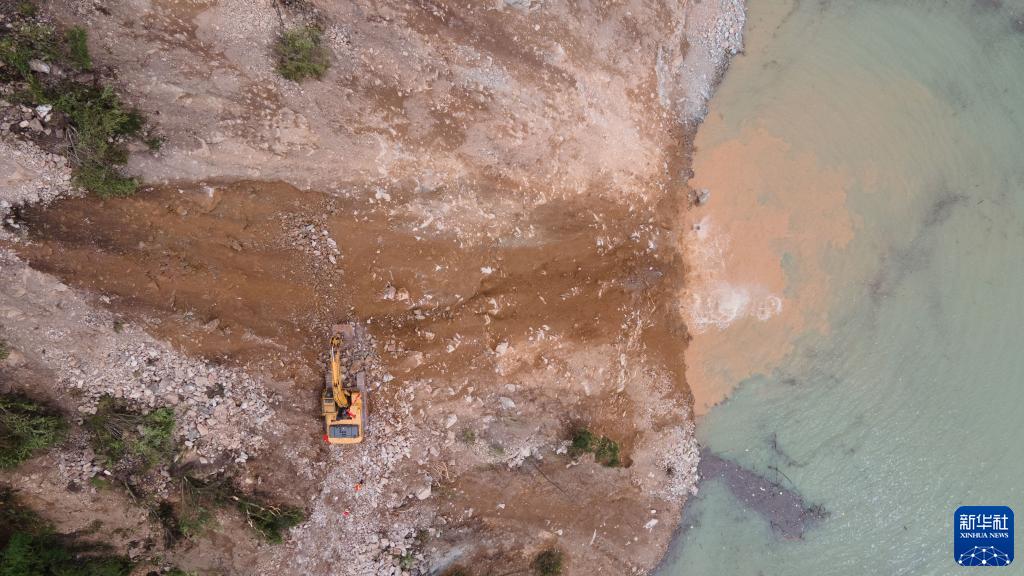 9月8日,四川路橋的工作人員搶修石棉縣與瀘定縣得妥鎮之間的道路(無(wú)人機照片)。