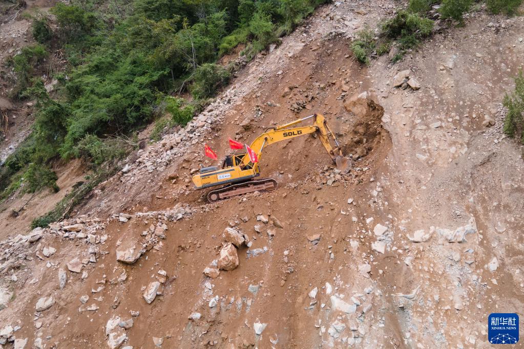9月8日,四川路橋的工作人員搶修石棉縣與瀘定縣得妥鎮之間的道路(無(wú)人機照片)。