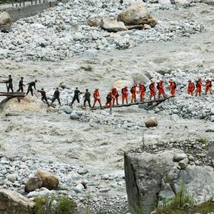 9月8日,在四川省甘孜州瀘定縣磨西鎮附近,救援人員站在臨時(shí)架設的小橋上向河對岸的村民運送生活物資。