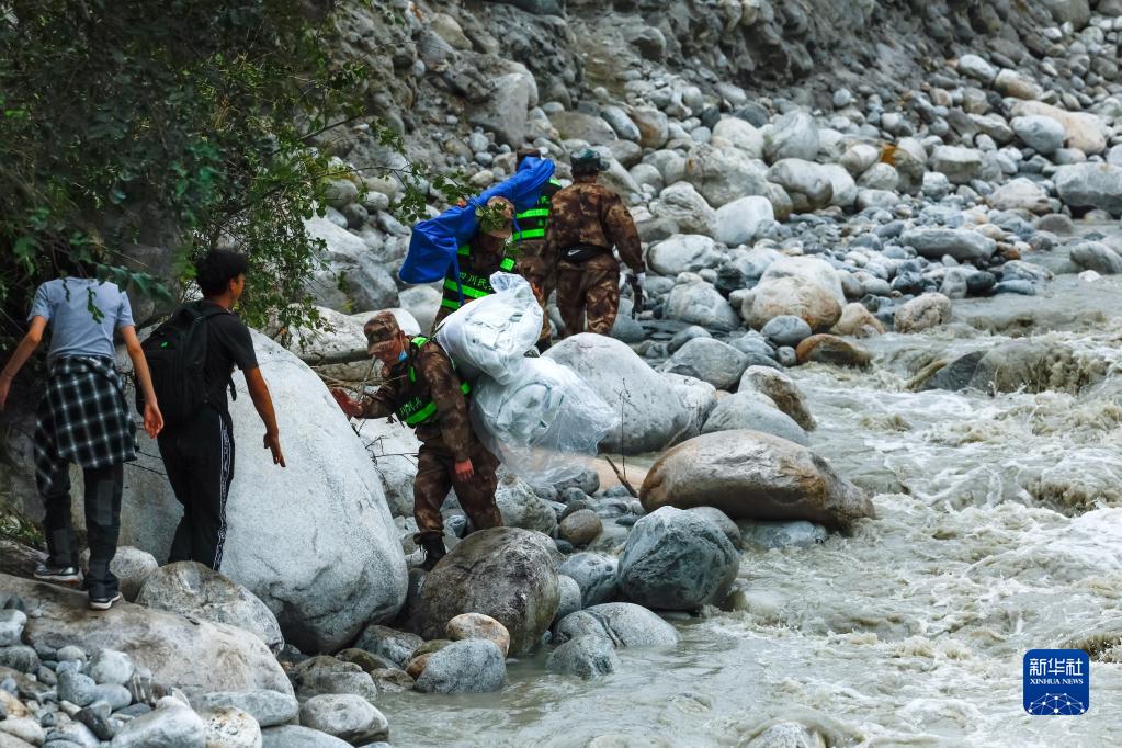 9月8日,在四川省甘孜州瀘定縣磨西鎮附近,救援人員沿著(zhù)磨西河畔的上山小路運送救災帳篷等物資。