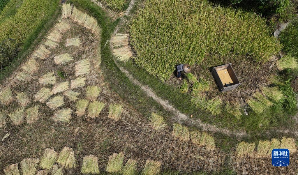 在中國農民豐收節即將到來(lái)之際,“世界灌溉工程遺產(chǎn)”“全球重要農業(yè)文化遺產(chǎn)”湖南省婁底市新化縣水車(chē)鎮紫鵲界梯田種植的水稻陸續進(jìn)入成熟期,田野一片金黃,農民利用晴好天氣搶收搶割。