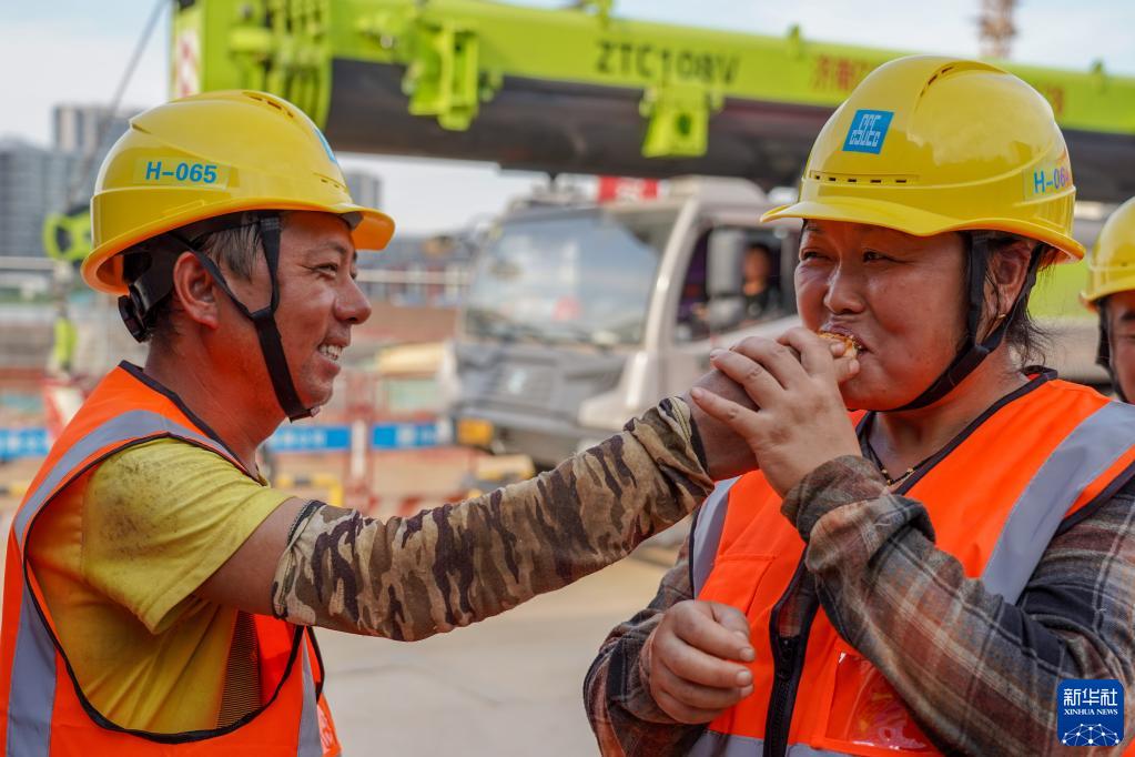 9月8日,來(lái)自河南濮陽(yáng)的賈慶全、張自忍(右)夫婦在濟南浪潮智能計算產(chǎn)業(yè)園建設項目現場(chǎng)品嘗月餅。