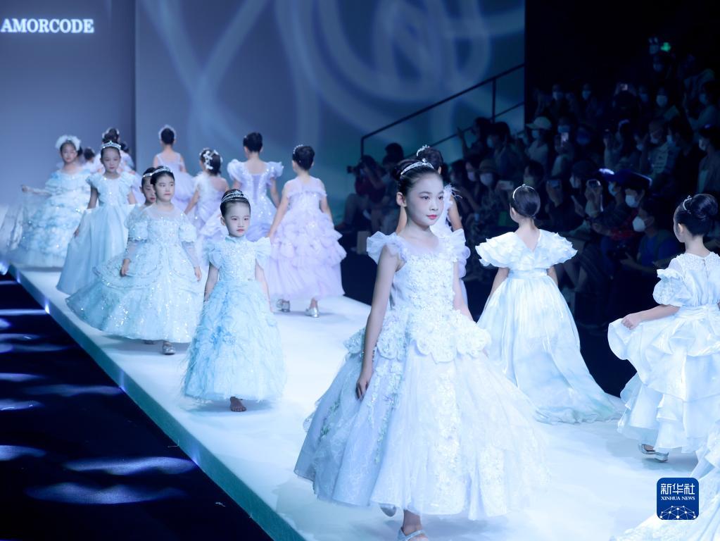 9月9日,小模特在北京中國國際時(shí)裝周(2023春夏系列)舉行的“AMORCODE”童裝發(fā)布會(huì )上展示童裝。