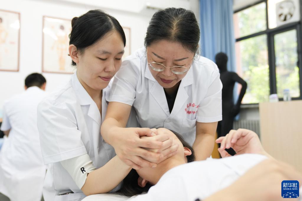 在北京聯(lián)合大學(xué)保健按摩實(shí)訓課上,張琳(右)握著(zhù)一位視障學(xué)生的手帶她感受按摩的力度和角度(9月8日攝)。
