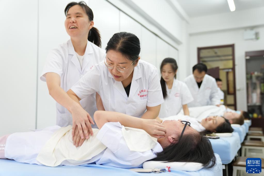 在北京聯(lián)合大學(xué)保健按摩實(shí)訓課上,張琳(前右)讓一位視障學(xué)生摸著(zhù)她的手感受按摩力度和角度(9月8日攝)。