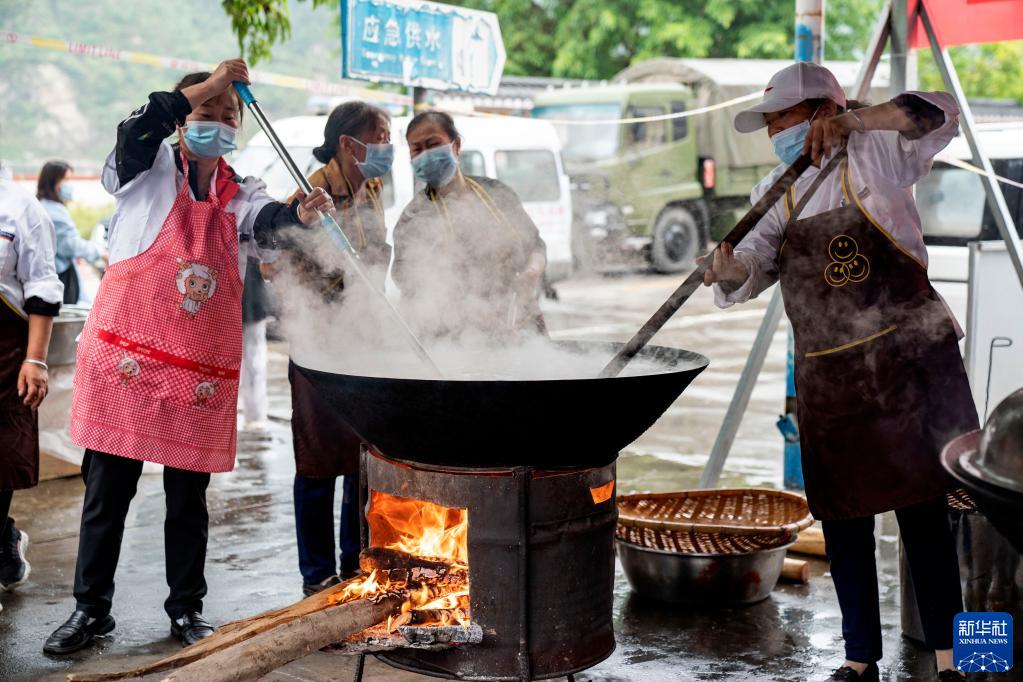 9月9日,在石棉縣新民鄉海耳村臨時(shí)安置點(diǎn),村民志愿者在做飯。