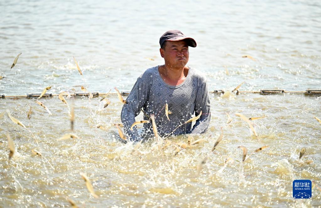 天津市濱海新區北塘街村民在蝦塘拉網(wǎng)捕蝦(9月9日攝)。