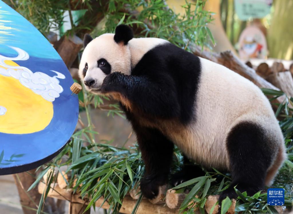 9月9日,在廣州長(cháng)隆野生動(dòng)物世界,大熊貓“帥帥”準備品嘗特制“月餅”。