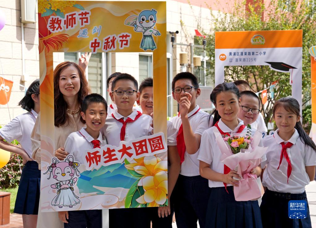 9月10日,蓬萊路二小的返校畢業(yè)生和班主任合影。