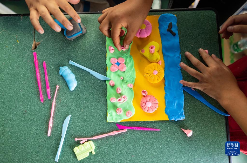9月10日,在瀘定二中臨時(shí)安置點(diǎn)的“帳篷課堂”里,來(lái)自得妥鎮的孩子們用橡皮泥制作創(chuàng )意“月餅”。