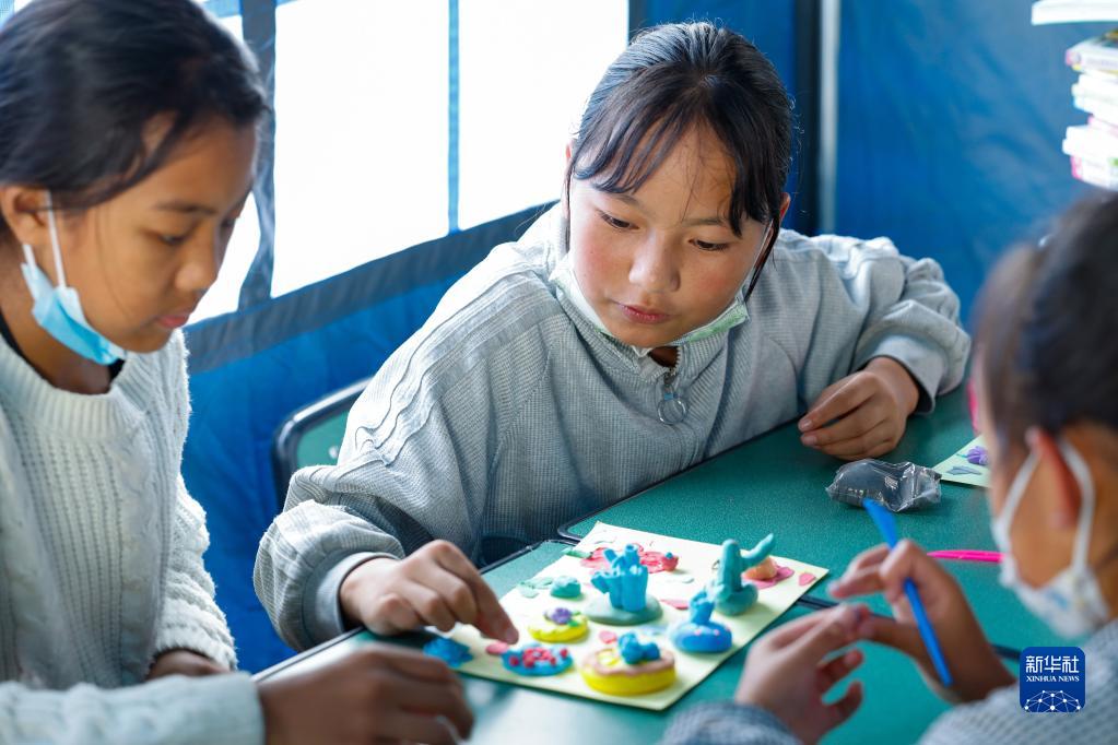 9月10日,在瀘定二中臨時(shí)安置點(diǎn)的“帳篷課堂”里,來(lái)自得妥鎮的孩子們用橡皮泥制作創(chuàng )意“月餅”。