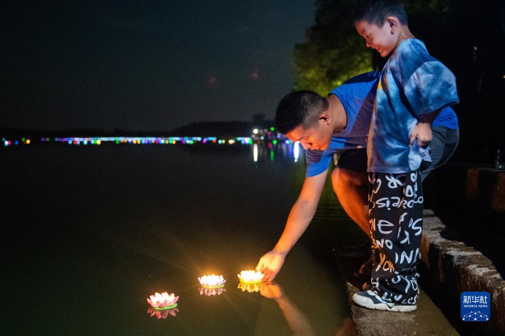 9月10日,在湖南省汨羅市新市鎮,居民在放河燈。