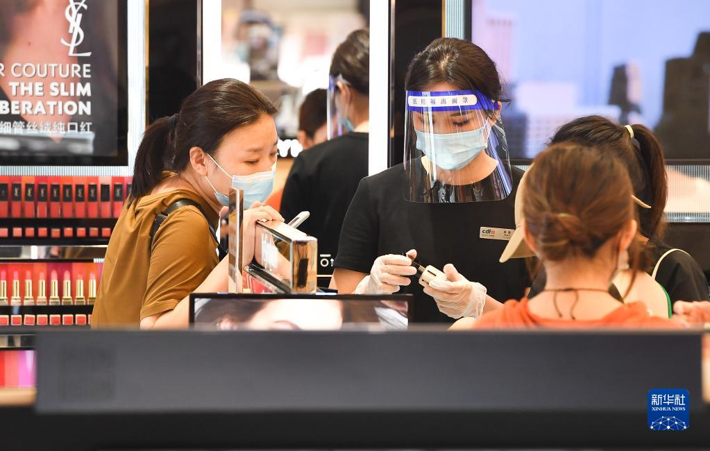 9月10日,游客在中免集團??谌赵聫V場(chǎng)免稅店選購免稅品。