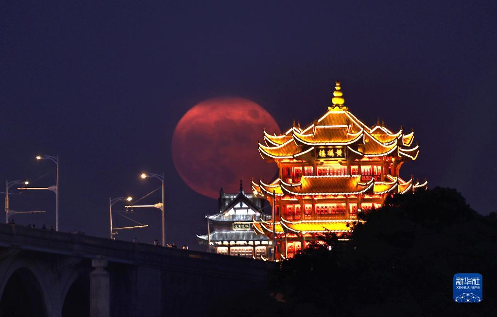 9月10日,一輪圓月從湖北武漢黃鶴樓后升起。