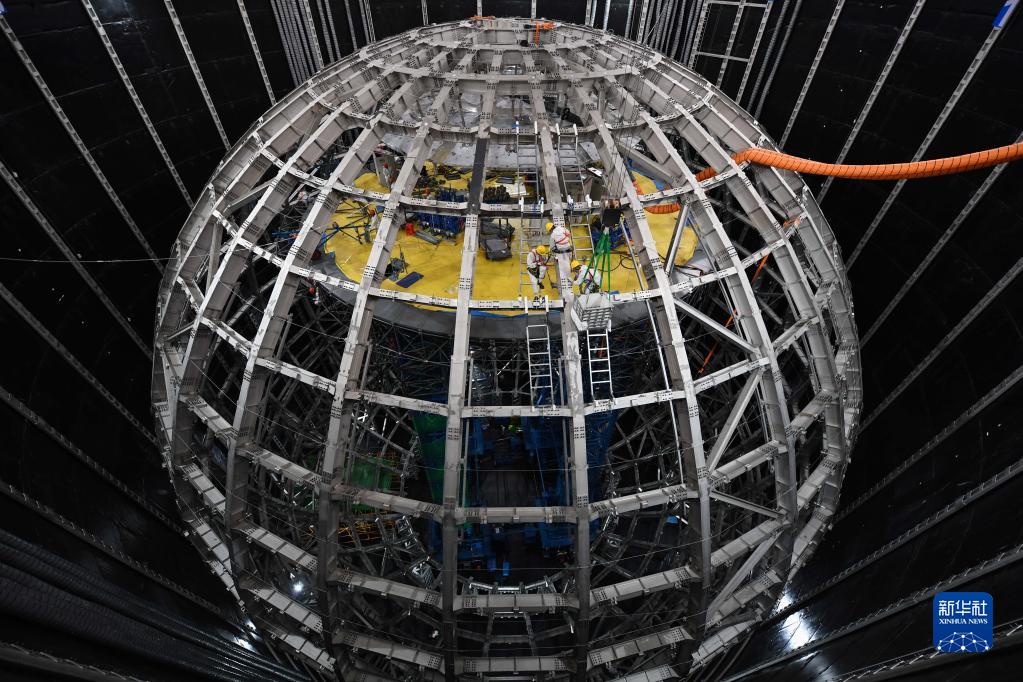 這是9月2日拍攝的位于地下700米的江門(mén)中微子實(shí)驗探測器,呈現出巨大的球形結構。
