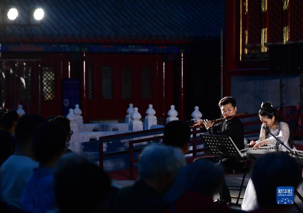 9月11日,民樂(lè )名家王溪(左)與吳茜在北京白塔寺內演出。