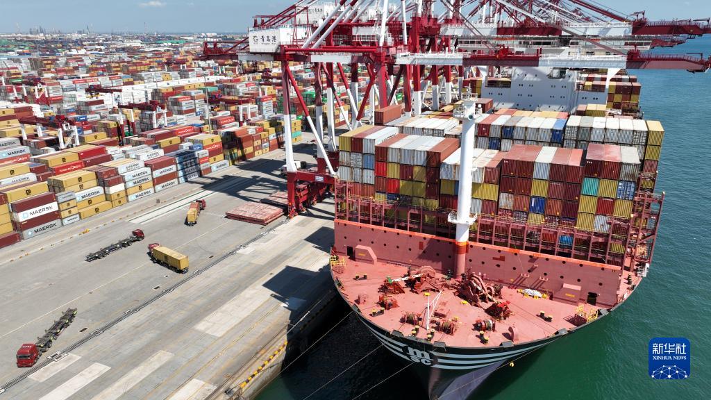 “地中海思辛”輪創(chuàng )青島港今年單船最大作業(yè)量(9月10日攝,無(wú)人機照片)。