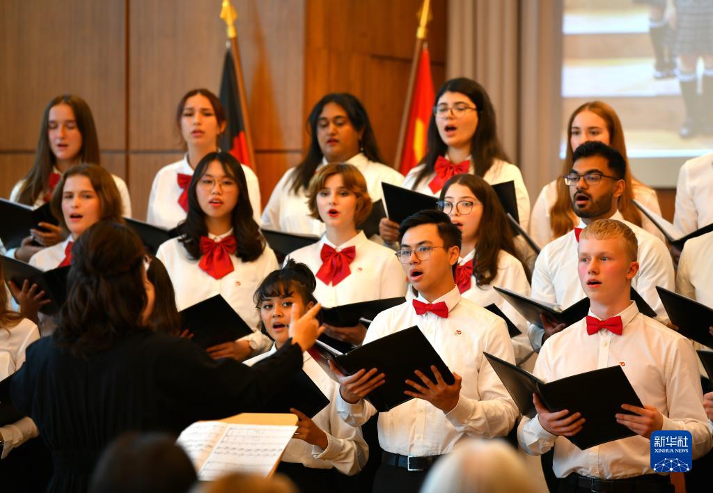 為慶祝中德兩國建交50周年,一場(chǎng)中德青少年云音樂(lè )會(huì )10日在德國北萊茵-威斯特法倫州埃森市舉行。當地伯樂(lè )中文合唱團與中國成都多所中學(xué)合唱團的同學(xué)們通過(guò)視頻連線(xiàn),合唱了《茉莉花》《康定情歌》《乘著(zhù)歌聲的翅膀》《當夢(mèng)想張開(kāi)翅膀》等中德歌曲。