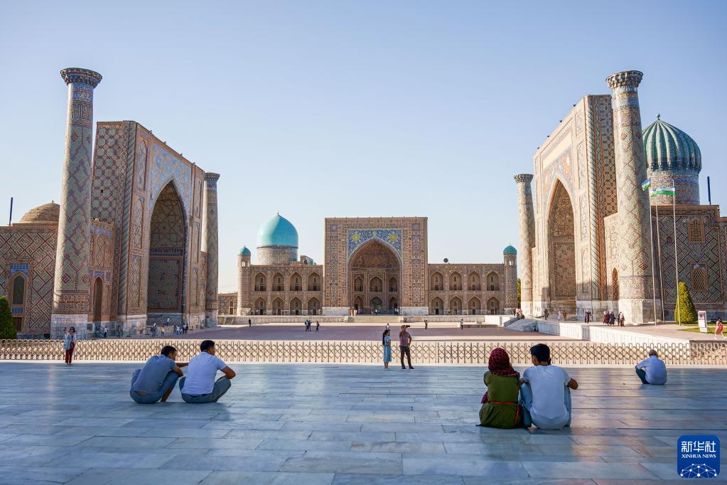 9月3日,人們在烏茲別克斯坦撒馬爾罕市列吉斯坦廣場(chǎng)游覽。