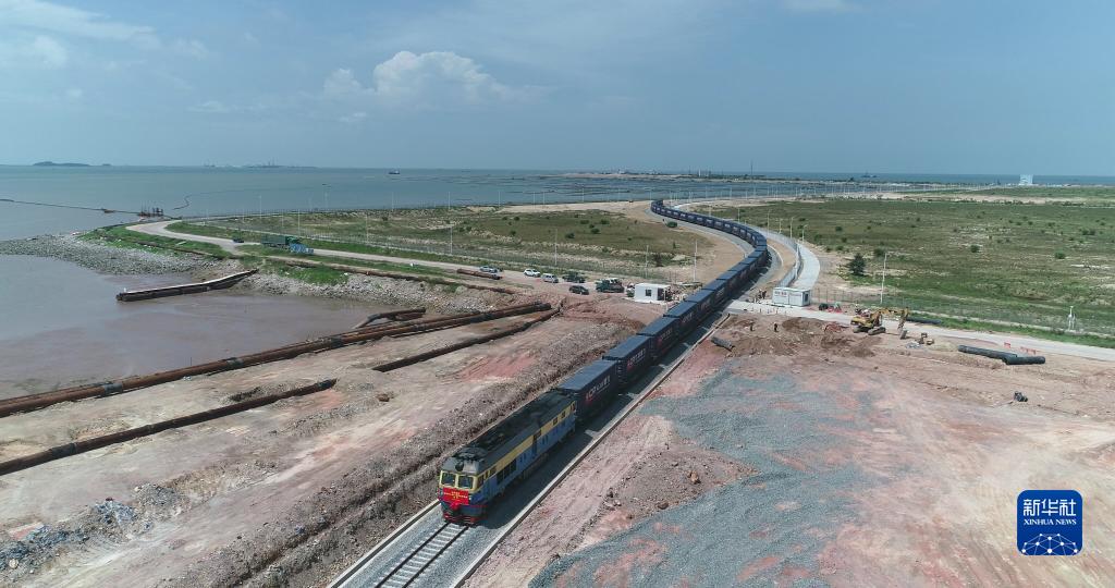 一輛中歐班列從欽州港集裝箱中心站駛離(2019年6月30日攝,無(wú)人機照片)。