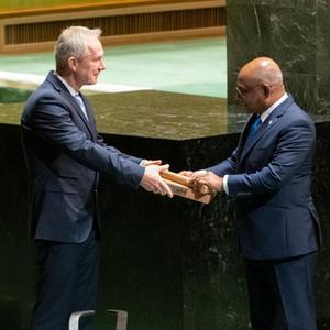 9月12日,在位于紐約的聯(lián)合國總部,第77屆聯(lián)合國大會(huì )主席克勒希(中)從上屆聯(lián)大主席沙希德(右)手中接過(guò)象征聯(lián)大主席權力的木槌。