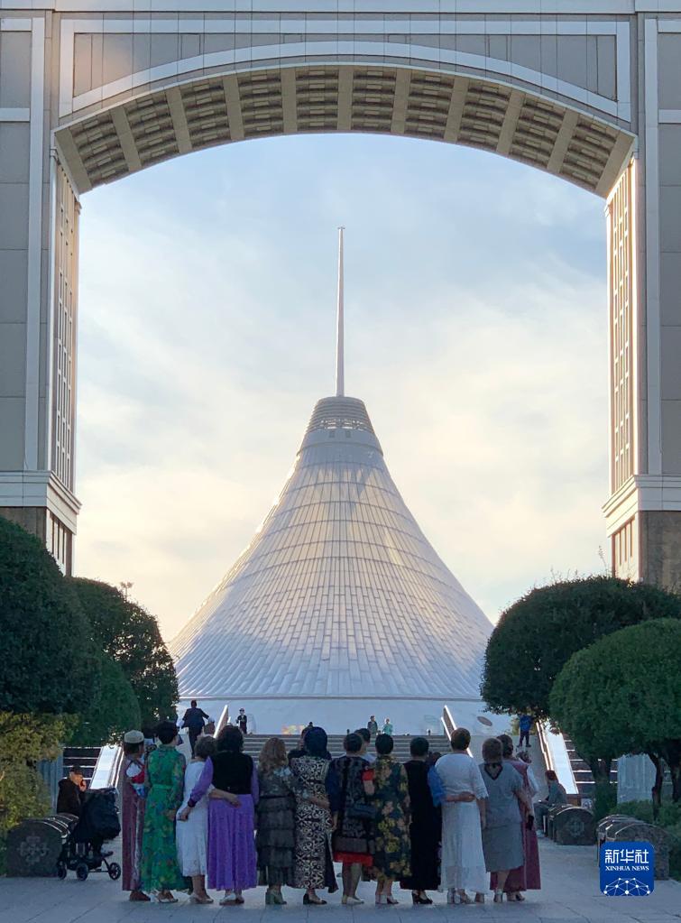 9月9日,人們在哈薩克斯坦努爾蘇丹著(zhù)名的“可汗之帳”購物中心前拍照。