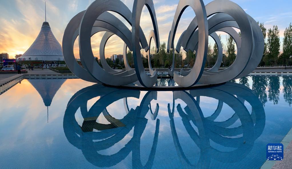 這是9月9日在哈薩克斯坦努爾蘇丹拍攝的雕塑和遠處的“可汗之帳”購物中心。