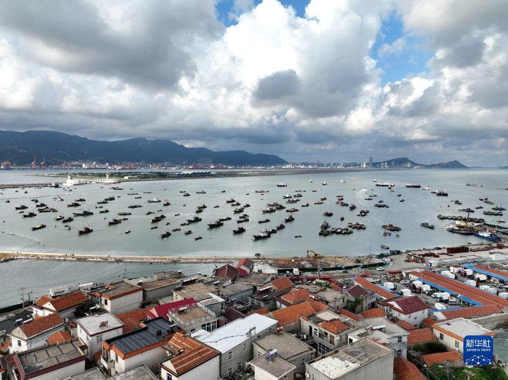 9月13日,漁船停泊在江蘇省連云港市連島中心漁港碼頭港灣躲避臺風(fēng)(無(wú)人機照片)。