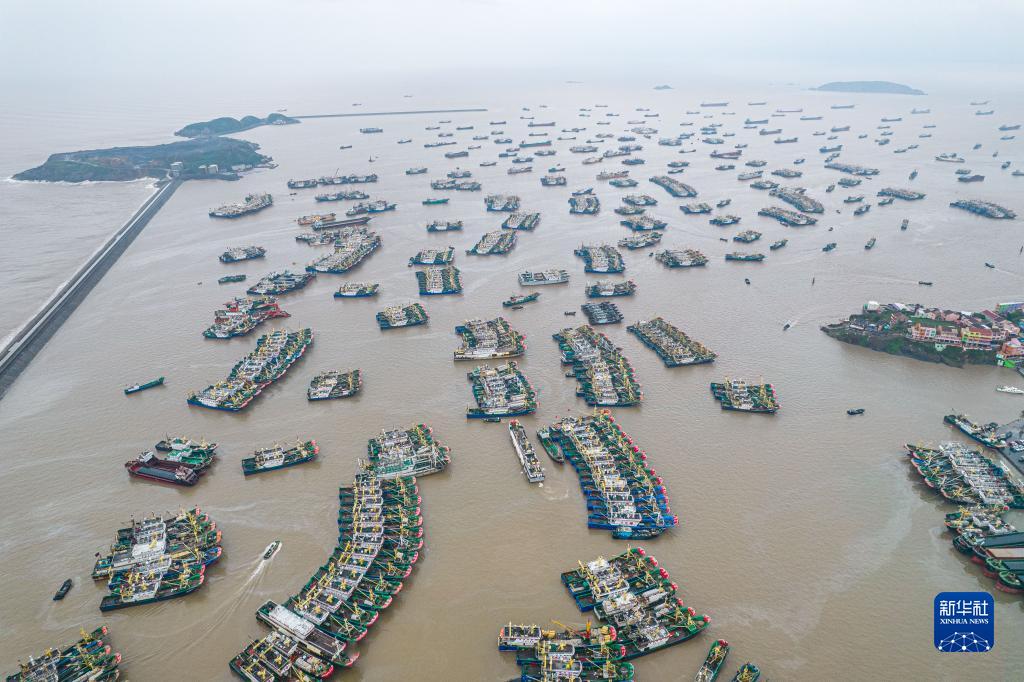 9月13日,漁船停放在浙江省溫嶺市石塘鎮箬山漁港內避風(fēng)(無(wú)人機照片)。
