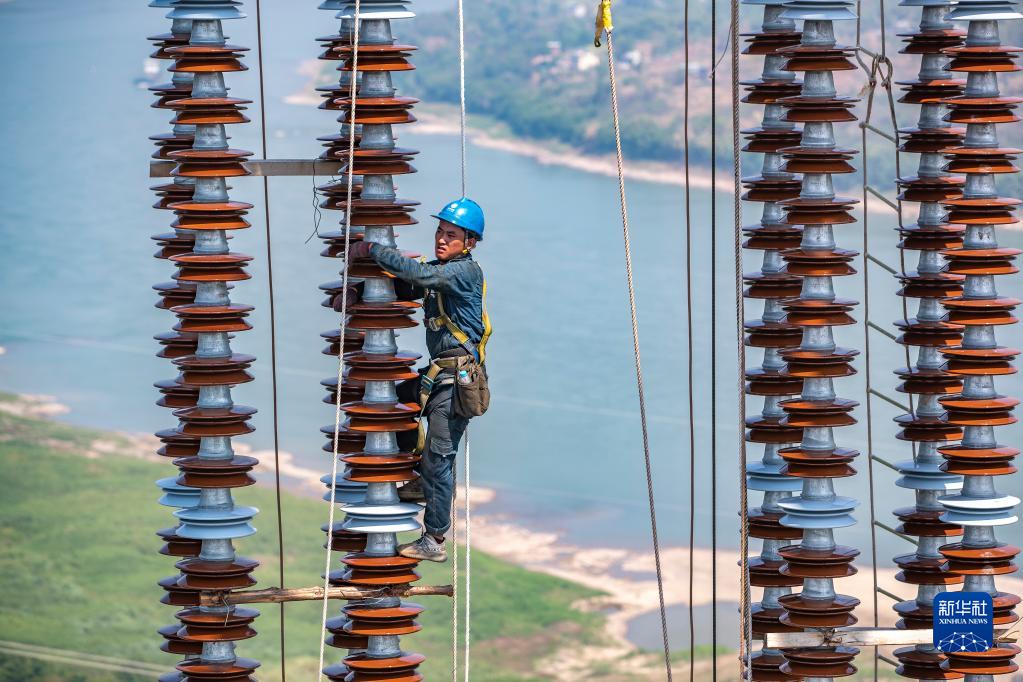 9月13日,工人在白鶴灘-浙江±800千伏特高壓直流輸電線(xiàn)路工程(重慶段)江津長(cháng)江大跨越施工現場(chǎng)作業(yè)。